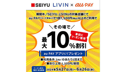 KDDIは、「SEIYU」「LIVIN」の対象店舗においてスマートフォン決済サービス「au PAY(コード支払い)」で1回1500円以上支払いをすると、即時に最大10%割引となるクーポンを対象者限定で配信している。期間は6月26日まで。