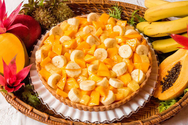 まさに気分は夏! 「南国フルーツのタルト」は、ココナッツ風味のカスタードクリームにパイナップル・パパイヤ・マンゴー・バナナなどのフルーツを飾り、南国の香りいっぱいのタルトに仕上げています。6月1日(土)~8月31日(土)の販売予定です。
