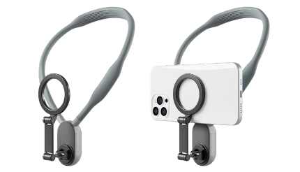新製品は、ピタッと磁力でくっつくマグセーフ対応のスマホネックホルダー。首に巻いて使用する。首回り最大58cmまで対応。くねくねと曲がる首掛け部分の先端にホルダーを搭載し、ホルダー部から2軸のアームが伸びその先にマグセーフ用リングを搭載している。マグセーフ対応スマホに磁石でしっかりと固定する。