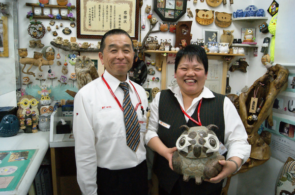 ご主人の石橋彰彦さんと局長の妻・由紀子さん。手にしているのは陶芸家が「最後の作品」として焼いた渾身のフクロウ像。