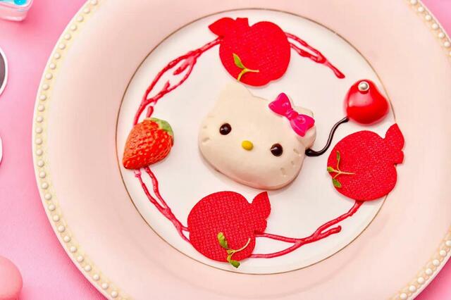 席に到着後、最初に提供されるシェフからのウェルカムデセールです。ココナッツと桃が2層に重なった柔らかなムースでキュートに仕上げたハローキティの周りに、リンゴ型のサブレとラズベリーのソースであしらいを施した、愛らしい一皿です。