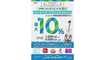 対象店舗は、対象決済サービス事業者の門真市内における加盟店のうち、同キャンペーンの事務局が対象として指定する店舗。対象となるキャッシュレス決済は、d払い、au PAY、楽天ペイ、AEON Pay。