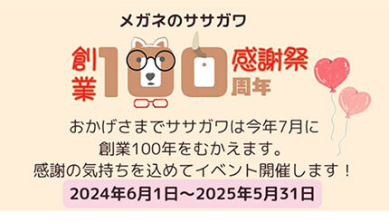 メガネのササガワ(東京都北区、運営:笹川時計店)は6月1日~2025年5月31日の期間、創業100周年記念イベントを開催する。