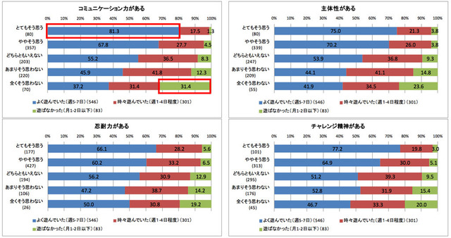特に、「コミュニケーション力があるか」という問いでは、「とてもそう思う」の回答者の8割以上は「よく遊んでいた」人だ。