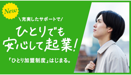 「ひとり加盟制度」では、店舗での勤務や店舗経営の経験がなくてもフランチャイズへの加盟が可能で、開店時のフォローやスタッフ募集支援、スタッフ育成支援、スタッフ不足時対策といった金銭面でのサポートなど、安心して運営に専念できるよう、さまざまなサポートを用意している。