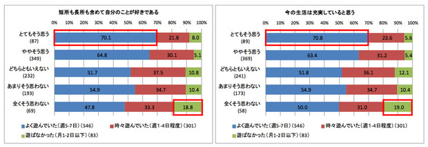 「長所も短所も含めて自分のことが好きである」「いまの生活は充実していると思う」という2つの質問についても、「よく遊んでいた」人の方が「そう思う」と考えている割合が多い。