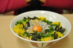 丼ぶりにご飯を入れて、しらすをのせ・・・