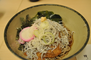 冷たい十割そば。トッピングには鳴門(なると)名産の糸ワカメはマスト!