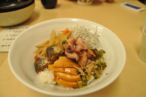 しらす、スモークチキン、ピリ辛いわしをトッピングし・・・オリジナル丼に。きんぴらやタコ漬けものせててんこ盛り。