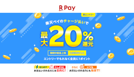 キャンペーン開始日の6月4日から、「楽天ペイ」アプリのポイント還元プログラムを一新する。ポイント進呈のタイミングが、チャージした「楽天キャッシュ」を用いた決済時に変わり、どのチャージ方法でも最大1.5%還元となる。このため「楽天ペイ」アプリで「はじめて」または「久しぶりに」支払いをする人は、合計最大21.5%還元となる。