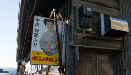 また、とあるお店の軒先には年代物の「ボンカレー」の看板が。モデルさんの和服姿がなんとも時代を感じさせますね。「牛肉 野菜入り」の文字も素敵です。この看板が掲げられた当時の街はどんな様子だったのでしょうか。想像を膨らませながら、先へと進みます。