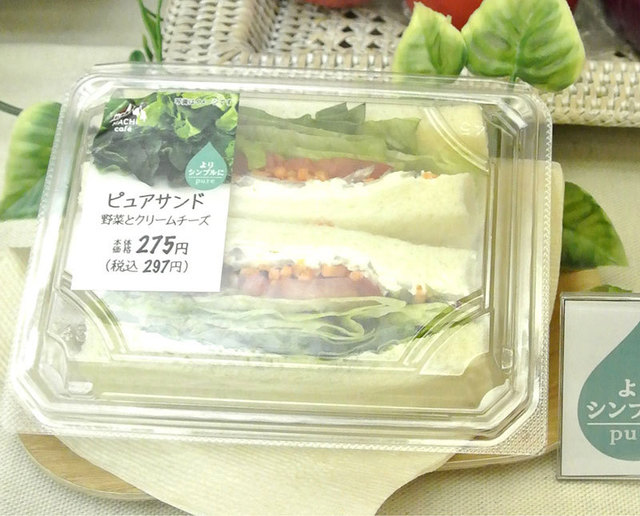 『ピュアサンド 野菜とクリームチーズ』は、フルーツサンドと同じふっくらパンに、ナチュラルクリームチーズと、レタスやトマトなどの新鮮な野菜をサンド。野菜をたっぷりと食べたい人にオススメです。