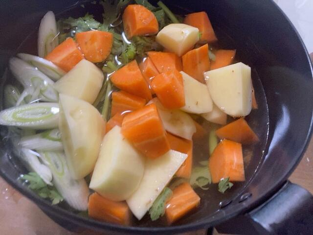一口大に切った野菜と出汁、水を入れて蓋をし、自動メニュー3(煮込み)を選択して調理スタート。鍋やインスタントラーメンより時間はかかりましたが、吹きこぼれることもなく、約18分でホクホクの煮物が完成しました!にんじんなど火が通りにくい野菜もしっかり柔らかくなっていました。