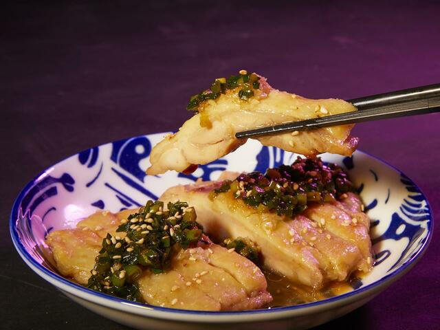 柔らかい鶏モモ肉に、葱と生姜の旨味たっぷりのソースがかかった一品。台湾では葱油鶏(ソンユーチー)と呼ばれる定番料理です。