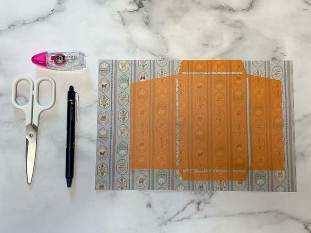 付録の柄ペーパーから1枚紙を選び、封筒テンプレートを裏側にした柄ペーパーに乗せます。