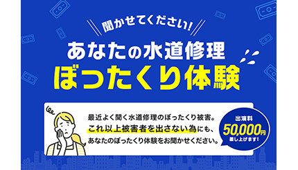 SAFELYは、同社の運営しているトイレや水回りのトラブル発生時にすぐに駆けつけてくれる、優良な水道事業者を選べるサイト「水道修理のセーフリー」において、水道修理費用を不当に請求された経験を持つ人を対象に、インタビューを募集している。なお、インタビューへの協力者には5万円が支払われる。