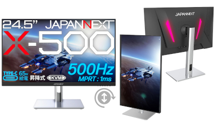 JAPANNEXT(ジャパンネクスト)は、24.5インチのフルHD(1920×1080)解像度IPSパネル搭載、500Hzの超高速リフレッシュレート、便利な昇降式多機能スタンドを搭載し、USB-C(最大65W)給電に対応したフラッグシップゲーミングディスプレイ「X-500」を6月7日に発売した。実勢価格は8万8800円。