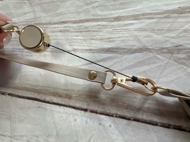 伸縮リールはゴールドですが、表面にはカードケース本体と同じフェイクレザー生地がついておりおしゃれ♪