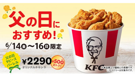 日本ケンタッキー・フライド・チキン(KFC)は6月14~16日の3日間限定で、全国のKFC店舗(一部を除く)で「父の日9ピースバーレル」を販売する。価格は2290円。