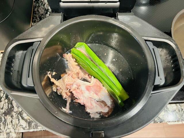 カットして残った鶏ガラは、コトコト煮込んで鶏ガラスープに活用できます。青ネギ・ショウガと一緒に2時間程煮込んで、鶏肉のうまみが凝縮したスープに。