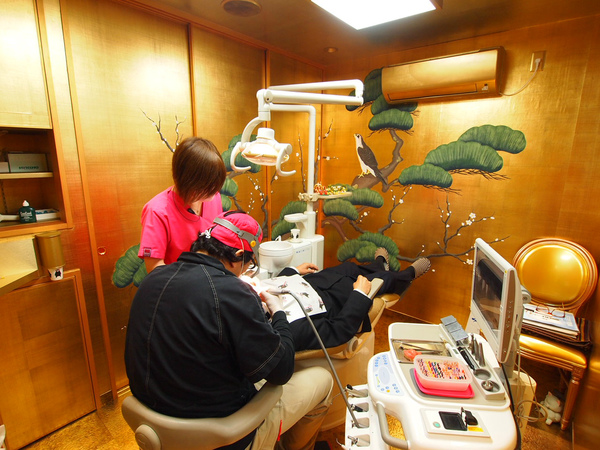 まずは院長の小田さんが使う、豊臣秀吉の金の茶室をイメージした「黄金の部屋」。エアコンまでゴールド! 金屏風をあしらった内装で、お殿様気分で診療を受けられます。