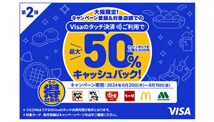 三井住友カードは6月20日~8月16日の期間、対象カード限定で「大阪限定 Visaのタッチ決済キャッシュバックキャンペーン 第2弾」を開催する。