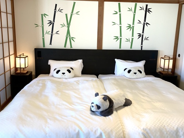 二間続きの和室のベッドや壁には、パンダや竹のモチーフが施されていて遊び心満載。