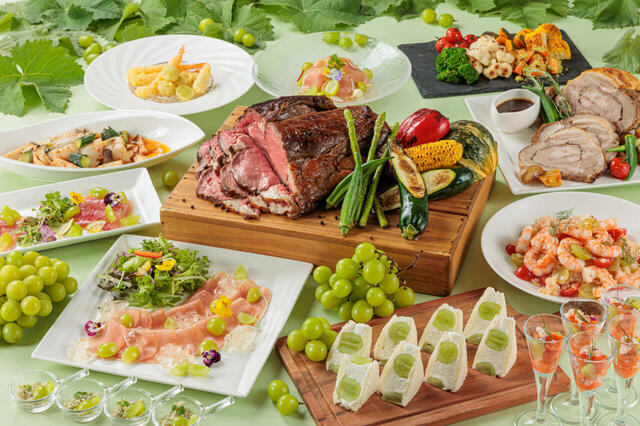 「シャインマスカットブッフェ」では、大阪府羽曳野市の若手農家が情熱と愛情を込めて育てたシャインマスカットを贅沢に使用した、オリジナリティ溢れる料理が登場。シャインマスカットの爽やかな甘みと生ハムの塩味を楽しめるシャインマスカットと生ハムのサラダや、鮪のカルパッチョにシャインマスカットを合わせたマリネなどの前菜のほか、人気メニューのローストビーフはシャインマスカットのソースとともに味わうことができます。