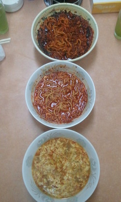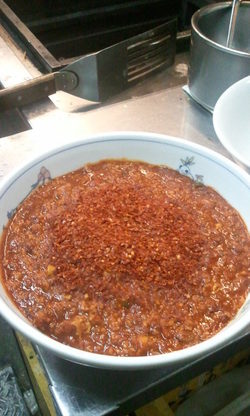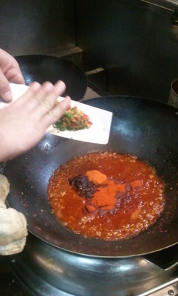 熱した鍋に豆板醤(トウバンジャン)・桂林辣醤(ケイリンラージャン)・朝天辣醤(チョーテンラージャン)・ヤンニョンなどの辛み成分が独自のブレンドで次々と放り込まれていく。