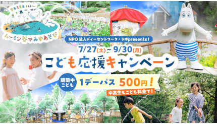 ムーミン物語が運営する「ムーミンバレーパーク」は、NPO法人ディーセントワーク・ラボの特別企画により、通常は大人料金の中学生・高校生を「子ども」とし、子ども(4歳~高校生)なら前売り・当日券ともに1デーパスが500円となる「こども応援キャンペーン」を7月27日から9月30日まで実施する。