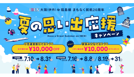 また、期間中に大阪(伊丹)~福島線の小児運賃と大人用運賃を同時に予約すると、抽選で10人にイオン商品券(1万円分)が当たる「家族みんなでおトク!キャンペーン」も実施する。