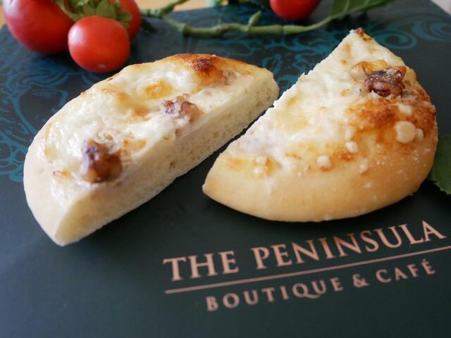 『ザ・ペニンシュラ ブティック&カフェ』の隠れた人気商品『4種チーズのフォカッチャ』。カナダ産の小麦粉を使用したフォカッチャ生地に、マスカルポーネ、グラナバダーノ、ゴルゴンゾーラ、モッツアレラの4種類のチーズが絶妙に組み合わさっています。
