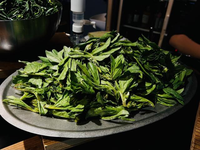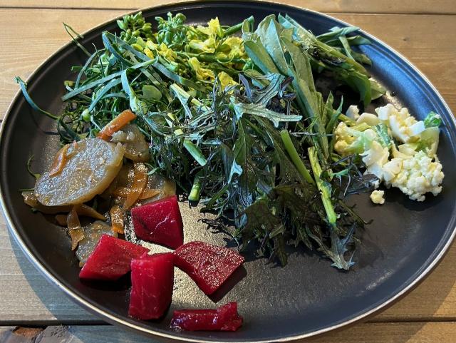 「ケール」はシャキシャキしておいしく、「そら豆の葉 ファーベ」は若干の苦みがアクセント。「ヤーコンきんぴら」や「カリフラワー卵サラダ」も絶品だった。