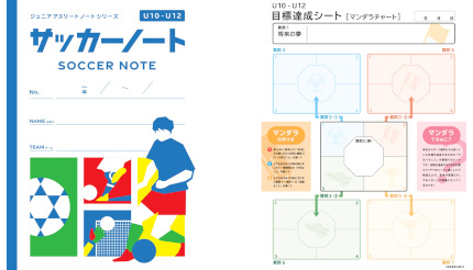 同ノートには、夢や目標を明確化して具体的な行動計画を立てるためのフレームワークとして使える、小学生向けに4マスバージョンとした「マンダラチャート」や、いつ・何を・どれくらい行うかを記録することで練習の計画を立てられる自主練習メニュー作成ページを備えるほか、睡眠時間や食事、挨拶といった生活習慣や、試合ごとに個人やチームのプレーの記録ができる。ほかにも、好きな選手の写真や合宿計画、技術練習の図といった、自由な発想で活用可能なページも用意している。