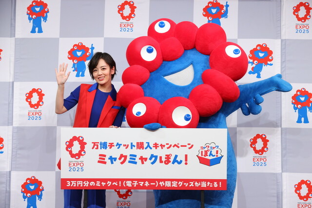7月17日に『ミャクミャクぽん!PR動画記者発表会』が行われ、2025年日本国際博覧会(大阪・関西万博)公式キャラクターのミャクミャクとスペシャルサポーターの伊原六花が登壇した。