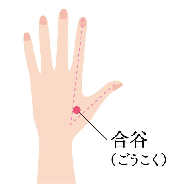 手の甲を上にして、人差し指と親指の間を人差し指の骨沿いにたどっていく途中の指の止まる部分にあるツボです。