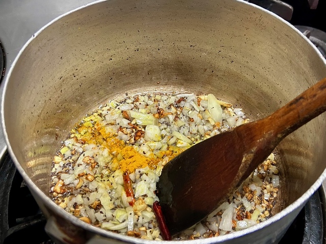 鍋にサラダ油を引き、中火にかけ、トウガラシ、マスタードシード、クミンを炒める。マスタードシードがはぜるまで炒めるのがコツ。