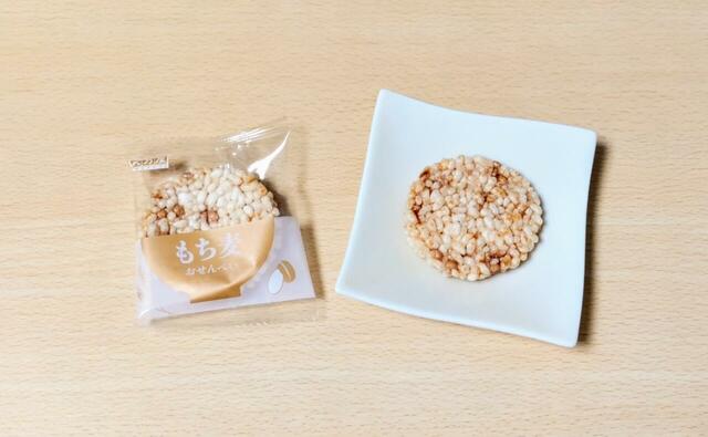 炊き立てのもち麦ご飯を揚げせんべいにした商品で、もち麦には食物繊維が多く含まれています。また本品の脂質は、一般的な揚げせんべいと比べて約半分の1枚あたり1.3g。