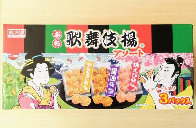 天乃屋のロングセラー商品「歌舞伎揚」が3種類のフレーバー&プチサイズになったアソートパックです。