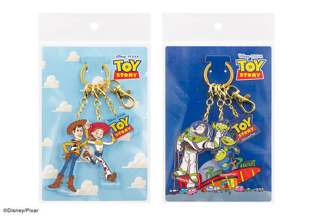 ウッディ、ジェシー、ブルズアイが大きく描かれたレトロ風味な8枚入ボックスには、ウッディとジェシーのアクリルキーホルダー付きセットが登場。