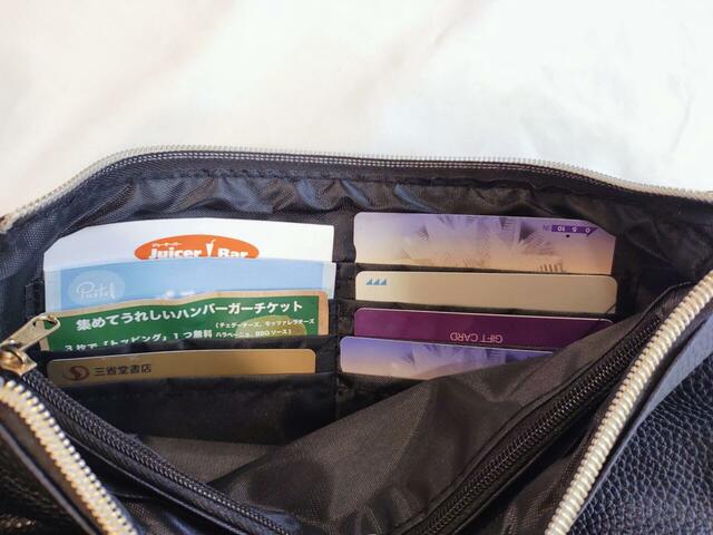 バッグの中には、カードポケット×8、ミニポケット×2、オープンポケット×2、ジッパーポケット×1つき。