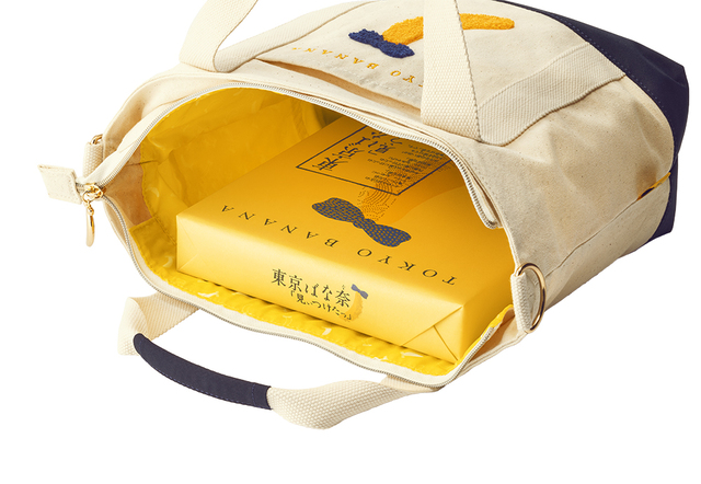 さらにチャームは東京ばな奈型で、ファンにはたまらない可愛さとなっています。東京ばな奈のイラストがちりばめられた内ポケットもついて、機能性も抜群。東京ばな奈の8個入がまるごと入るサイズなので、つい多くなりがちな荷物もまとめて持ち歩ける仕様となっています。