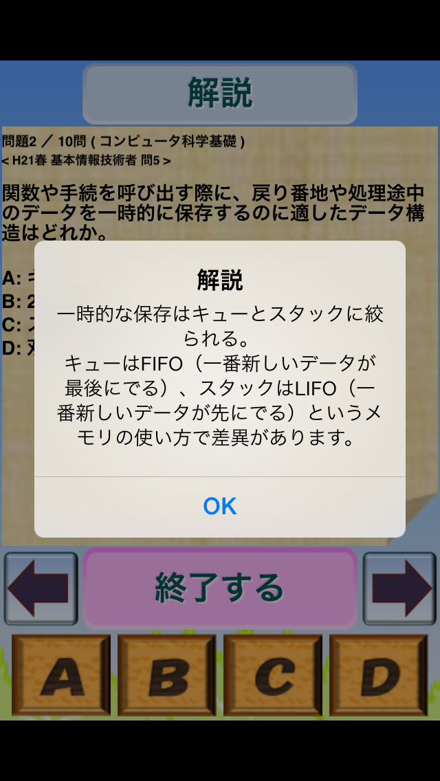 IT系の仕事への転職前に取っておきたい資格「基本情報技術者」の勉強がクイズ形式でできます。同資格のためのアプリはたくさんありますが、このアプリは、画面がカラフルなのと、フォントがゴシック体で読みやく、やる気が持続しやすいのが特徴です。問題文に対する選択肢が毎回変わるので、繰り返しの学習にも適しています。