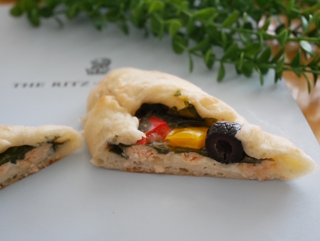 フォカッチャの中には、下からほうれん草とサーモンとチーズ、その上には赤パプリカと黄パプリカ、オリーブ、ほうれん草とチーズがたっぷりと入って具沢山!