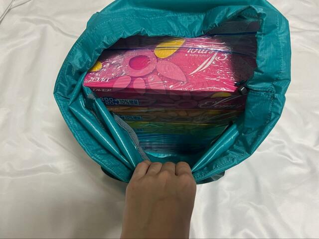 以上のものが入りました!筆者の所感だと、スーパーのLサイズのビニール袋よりも1.2倍くらい入ったかなと思います。