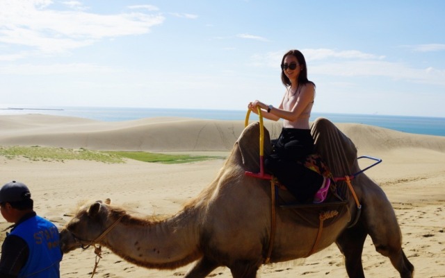 鳥取砂丘で、本物のラクダにまたがって周辺を歩く体験が出来ます。