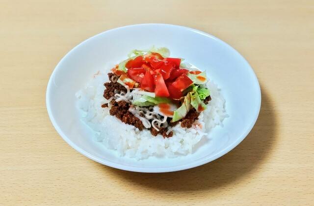 つくり方は、まずタコスミートを湯煎してから、ご飯の上に盛ります。その上に、市販のチーズ、刻んだレタス&トマトをのせるだけ。