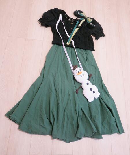 黒トップスとグリーンのスカートを合わせて、戴冠式のアナ風バウンドコーデと合わせても可愛い♪