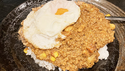 ハバネロを主体に、シナモンより香りが強いカシア、クローブ、マスタードシードなどのスパイスを利かせ、ゴロッゴロの鶏挽肉で食感を主張したカレー。鶏肉は決まった肉屋から仕入れ、自分で粗挽きにする。国産の朝びきだという。