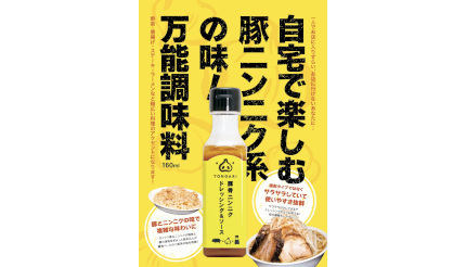 「TONGARI 豚骨ニンニクドレッシング&ソース」は、豚骨の深いコクとニンニクのパンチの効いた風味を融合させた独自の調味料。「二郎系」として話題になっており、シンプルなサラダから肉料理、炒め物、パスタといった、さまざまな料理に幅広く使用できる。